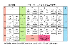 2026/04/09 デイケアプログラム 4月のデイケアプログラム アサープ月間予定表 Fアサープ月間予定表 アーカイブ 2026年4月 2026年3月 2026年2月 カテゴリー アルコール・薬物家族グループお知らせギャンブルワークショップギャンブル家族グループデイケアプログラムビギナープログラム問診票はこちら家族教室面会